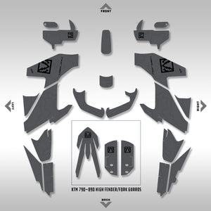 In The Box: Includes graphics for the headlight bezel/fairing, side panels (F & R), fork guards, front fender (high & low) and the swingarm. **This kit DOES include pieces for the 890 front fender and fork guards for those using those parts for a high fender.